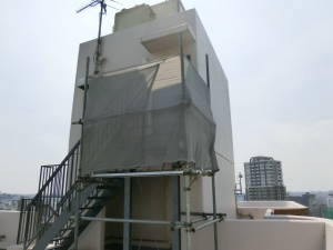| コメント | 目黒駅が近いこともあり、日中の人通りが多く、打ち合わせで搬入出は人通りの少ない6:00頃から開始しました。警備員を配置し事故なく完了することができました。また、一部の塗装面は躯体の梁に乗って作業可能とのことだったので落下防止のみの施工となりました。 |